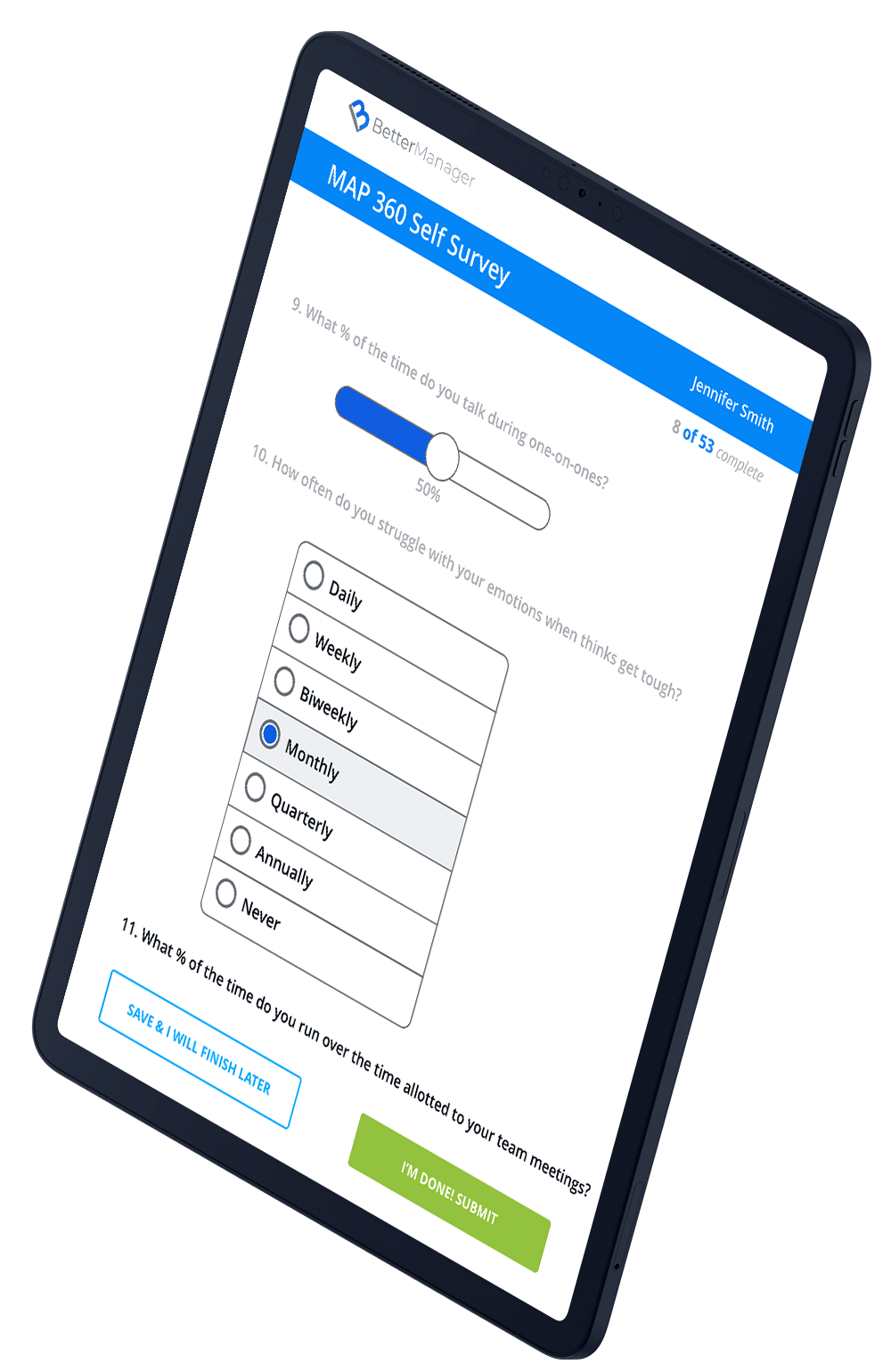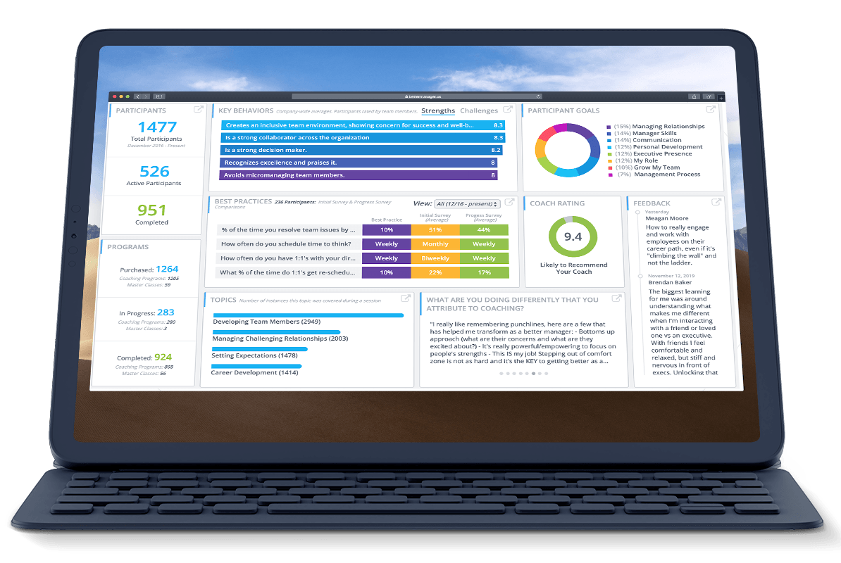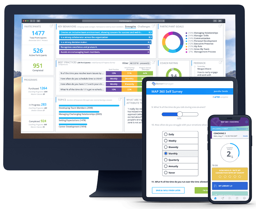 BetterManager's best-in-class 360º Surveys are sent to leaders as well as to their team. It is an in-depth and pragmatic 360 survey tool utilizing the best practices and key behaviors from leading sources such as Google Oxygen/Aristotle, Gallup, Harvard Business School and our years of professional experience.
