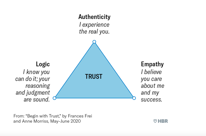 Before we discuss the benefits of how important it is to cultivate trust, let’s look at the root cause of why there could potentially be a lack of it. Trust has three core drivers (also known as The Trust Triangle - see the diagram below): Authenticity, Logic, and Empathy. When trust is lost, it can almost always be traced back to a breakdown in one of them. To build trust as a leader, you first need to figure out which driver you “wobble” on. To be a truly empowering leader, you need to take stock of where you wobble not only in your relationships with others but also in your relationship with yourself. Calling yourself into account is a vital component of building trust.